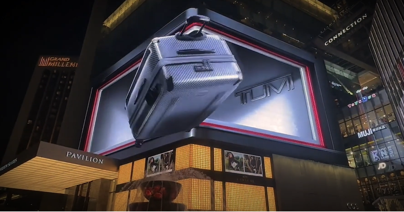 Travel and lifestyle brand Tumi promoted its TEGRA-LITE hardside luggage collection with a 3D OOH ad this year. The 30-second advertisement used 3D anamorphic billboards and created the illusion of the suitcases coming together in mid-air. The suitcases would collide with the surrounding walls in an attempt to illustrate the durability of the product's Tegris material.
