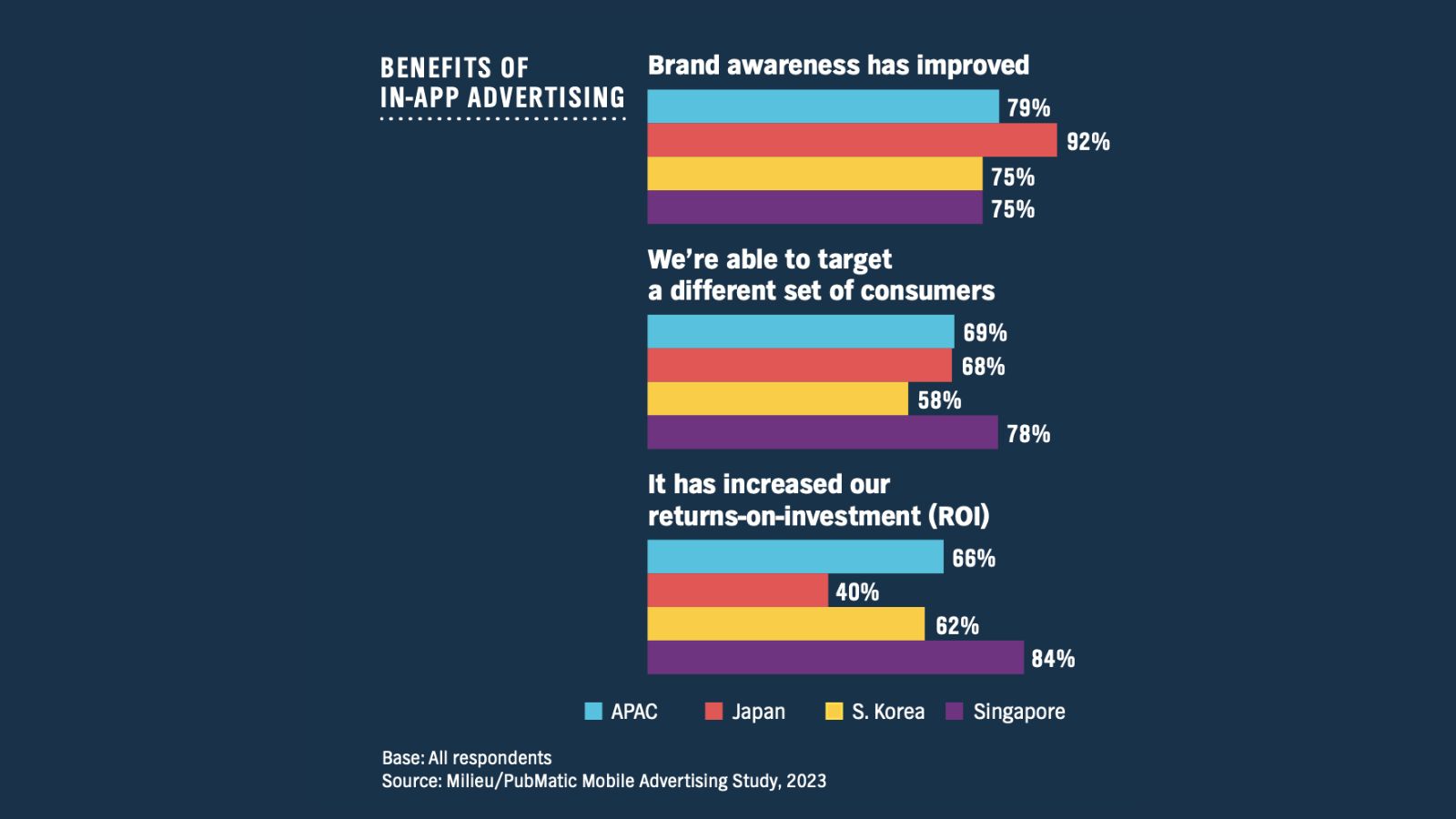 For example, 92% of Japanese mobile marketers reported an improvement in brand awareness, but only 40% noticed an increased return on their ROI. In contrast, Singapore’s more mature mobile advertising market sees an 84% increase in ROI despite a 75% improvement in brand awareness.