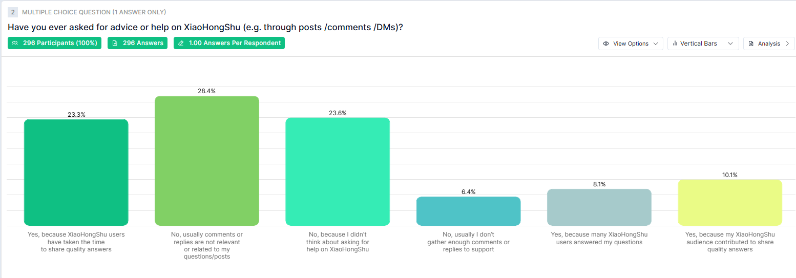 According to the survey, fewer than half of Hongkongers (41.5%) have sought advice or help on Xiaohongshu, despite 58% reporting that they use the platform. Among those who did seek help, the most common reason (23.3%) was the high quality of answers provided by other users.