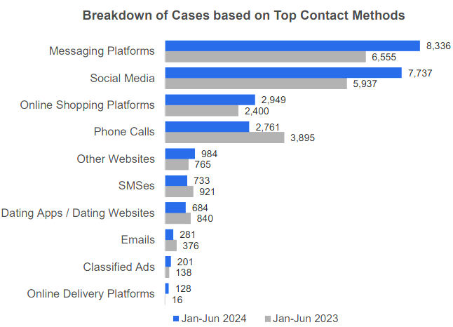 Scams accounted for 92.5% of these 28,751 cases in the first half of 2024. This is up from 22, 853 cases last year.