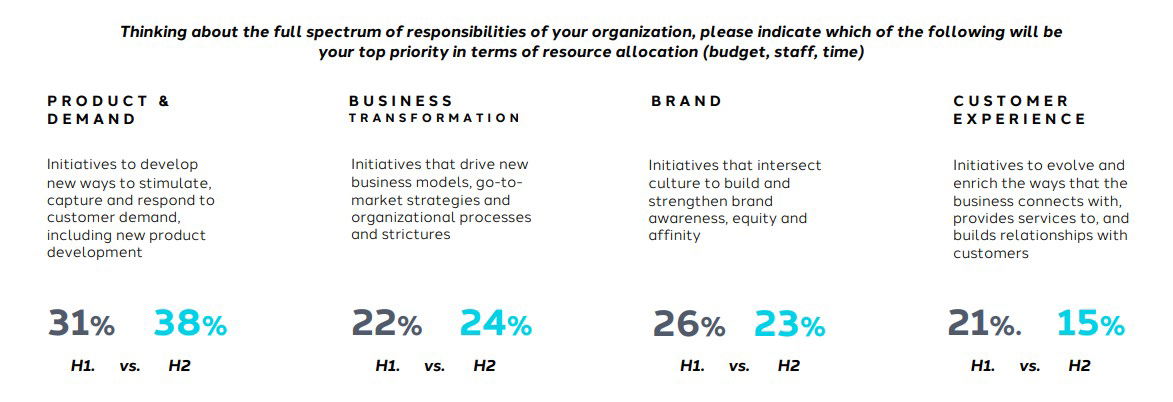 On the other hand, global CMOs will prioritise a new growth agenda in the allocation of their resources, according to the report. This is reflected in their focus on product and demand initiatives above all, with 38% of global CMOs focusing on the area in H2 2025.