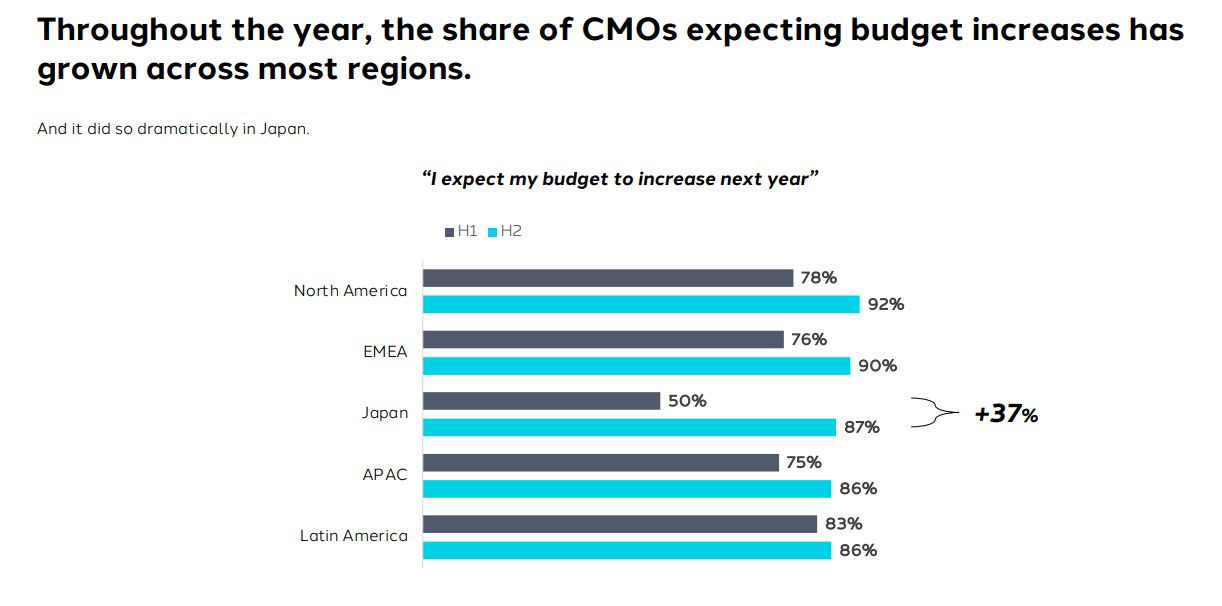 Over 80% of APAC CMOs are expecting an increase in budget allocations for 2025, with Japan showing the most significant increase from 50% to 87%, according to a study by dentsu.