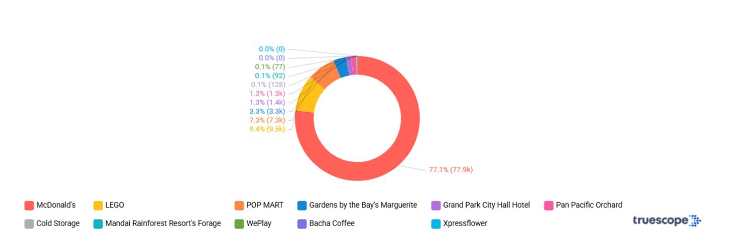 From 9 January to 9 February 2026, 11 brands captured the city’s attention, generating over 92,100 social engagements, according to media intelligence firm Truescope. The brands include McDonald's, LEGO, POP MART, Gardens by the Bay's Marguerite, Grand Park City Hall Hotel, Pan Pacific Orchard, Cold Storage, Mandai Rainforest Resort's Forage, WePlay, Bacha Coffee, Xpressflower and Pan Pacific Orchard.