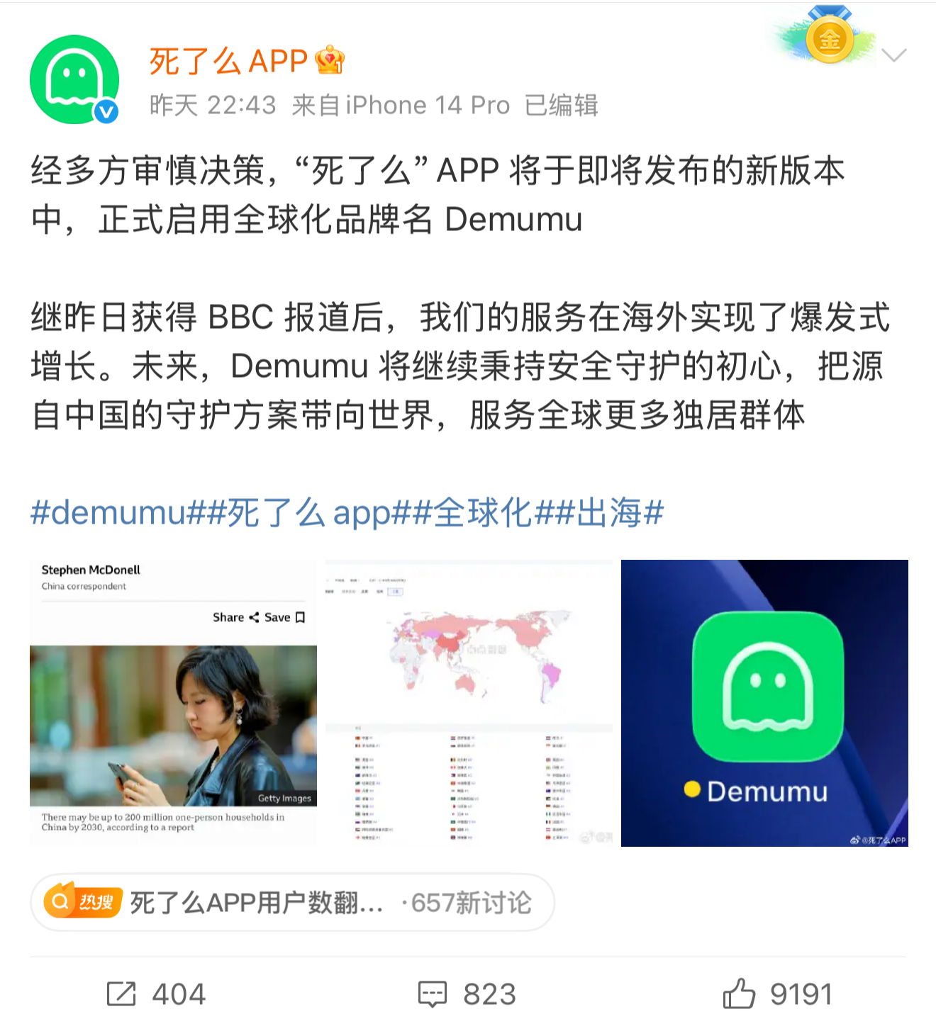 On Tuesday, "Are You Dead" announced on its official Weibo account that it will soon launch a new version of its app under the global brand name Demumu. The app is already listed as Demumu on Apple’s paid app chart, where it currently ranks second after briefly topping the chart earlier this week.