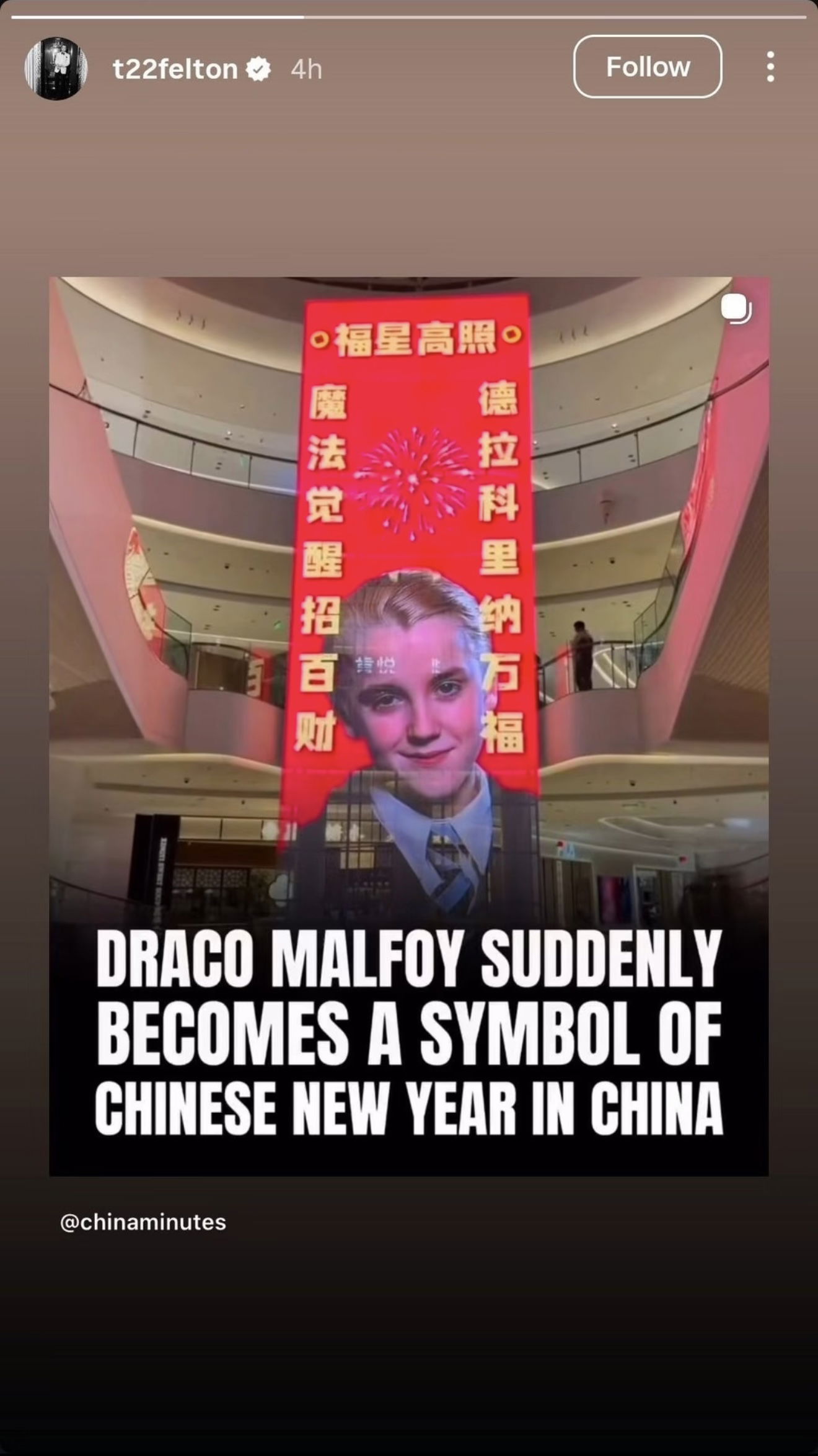 Tom Felton, the actor who portrayed Draco Malfoy, acknowledged the viral trend in an Instagram Story. The repost brought another wave of discussion across social platforms in China.