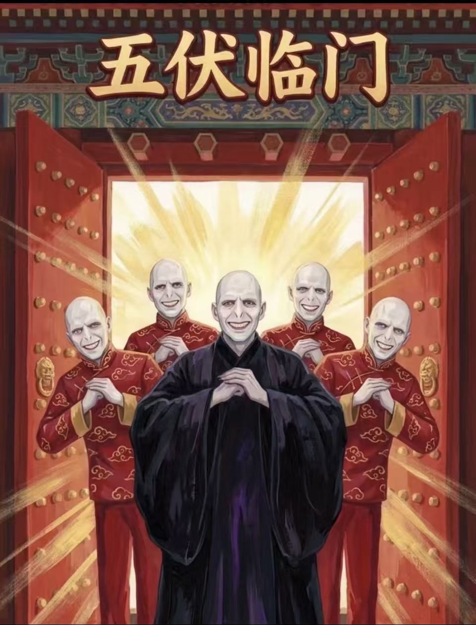 This inspired netizens to create a twist on the traditional blessing term Wǔ Fú Lín Mén (五福临门), meaning the five blessings arrive at the door. They photoshopped five images of Voldemort onto red paper, replacing the original Fú with Voldemort's Fú. The resulting pun, 五伏临门, became a viral image humorously suggesting an arrival of Voldemort blessings.