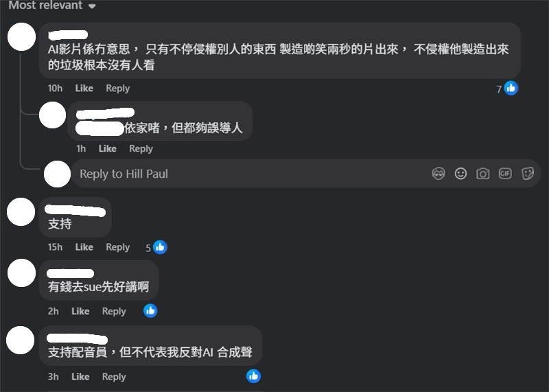 The statement from the Labour Union of Dubbing of Hong Kong (香港配音從業員工會) posted on its Facebook page declared that no organisation, enterprise, or individual may record, collect, use, modify, edit, or reproduce the voice samples of the declarants in any form for the purposes of generative AI training, simulation, voice synthesis, or other similar technologies without the explicit written consent from the individual or the union.