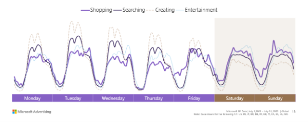 Microsoft users are typically employed and affluent, making them attractive for advertisers in higher-consideration categories. While shopping and entertainment activity usually peaks on weekends, usage is spread across the workweek, signalling that discovery, planning and decision-making now happen continuously, not just during traditional leisure windows.