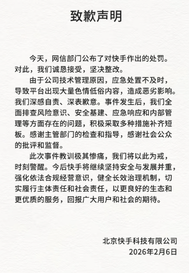 In response to the investigation's findings, Kuaishou apologised in a statement on its WeChat account, explaining that due to technical management issues, its emergency response was not timely, resulting in a significant amount of pornographic and vulgar content on the platform and causing a negative impact.