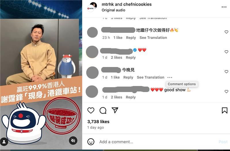 The collaboration has garnered over 3,000 likes on MTR's Instagram, with many applauding MTR's smart move to promote the concert, while some wished Tse a good performance on stage, a check by MARKETING-INTERACTIVE saw.
