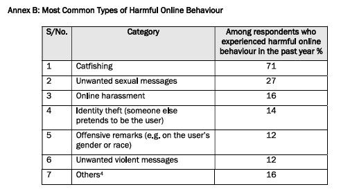 Among those who reported harmful online behaviour, catfishing was the most common, mostly occurring on WhatsApp (56%) and Facebook (41%). Other frequently reported behaviours included unwanted sexual messages and online harassment.