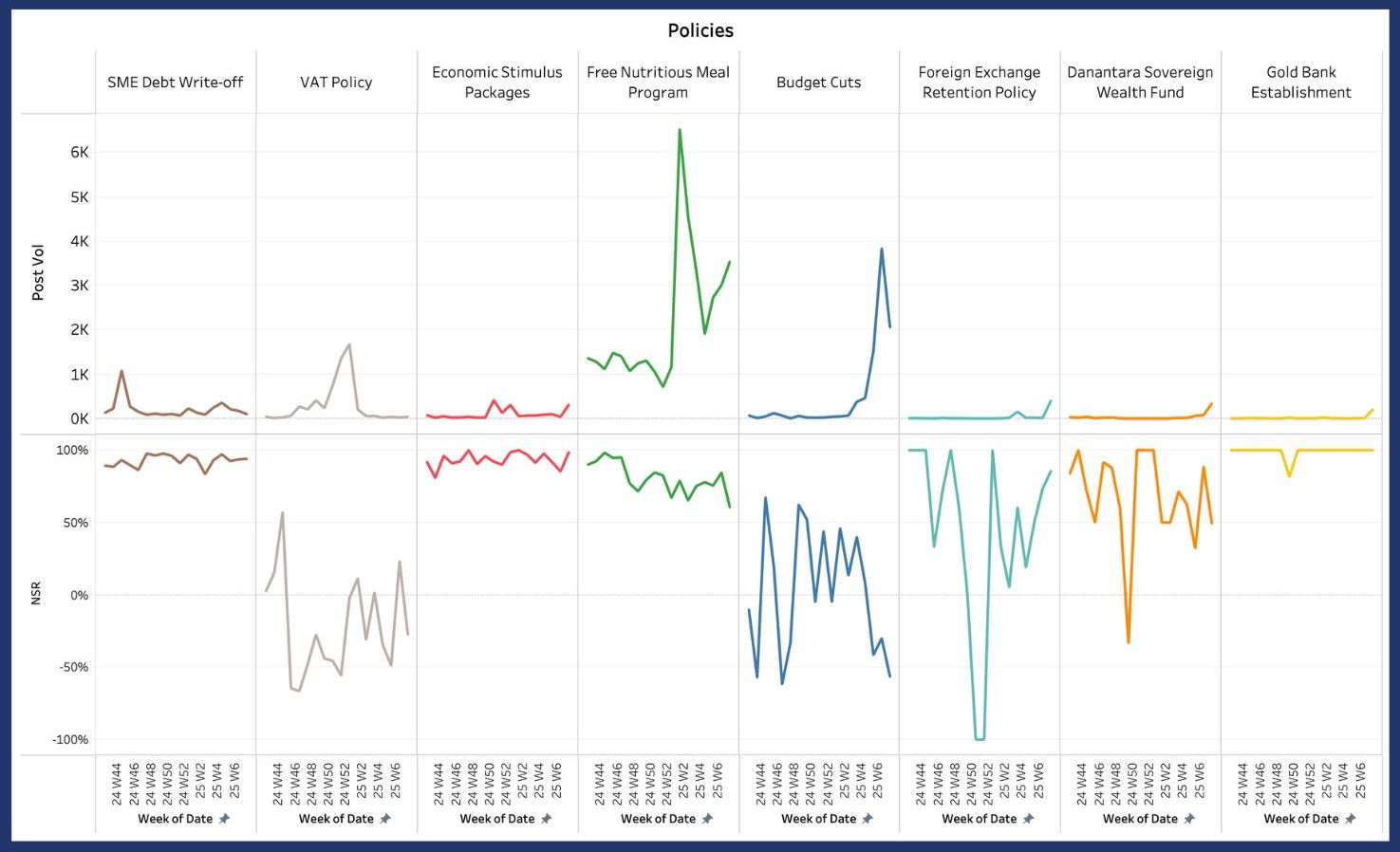 His January VAT policy had mixed reactions: Middle-class support versus luxury buyers' discontent, according to Tocanan. Meanwhile, an IDR 38.6 trillion (US$2.4 billion) stimulus - rice aid for 16 million families, electricity discounts, and MSME tax breaks - earned 68% approval on Facebook, though Reddit and Twitter raised fiscal concerns.