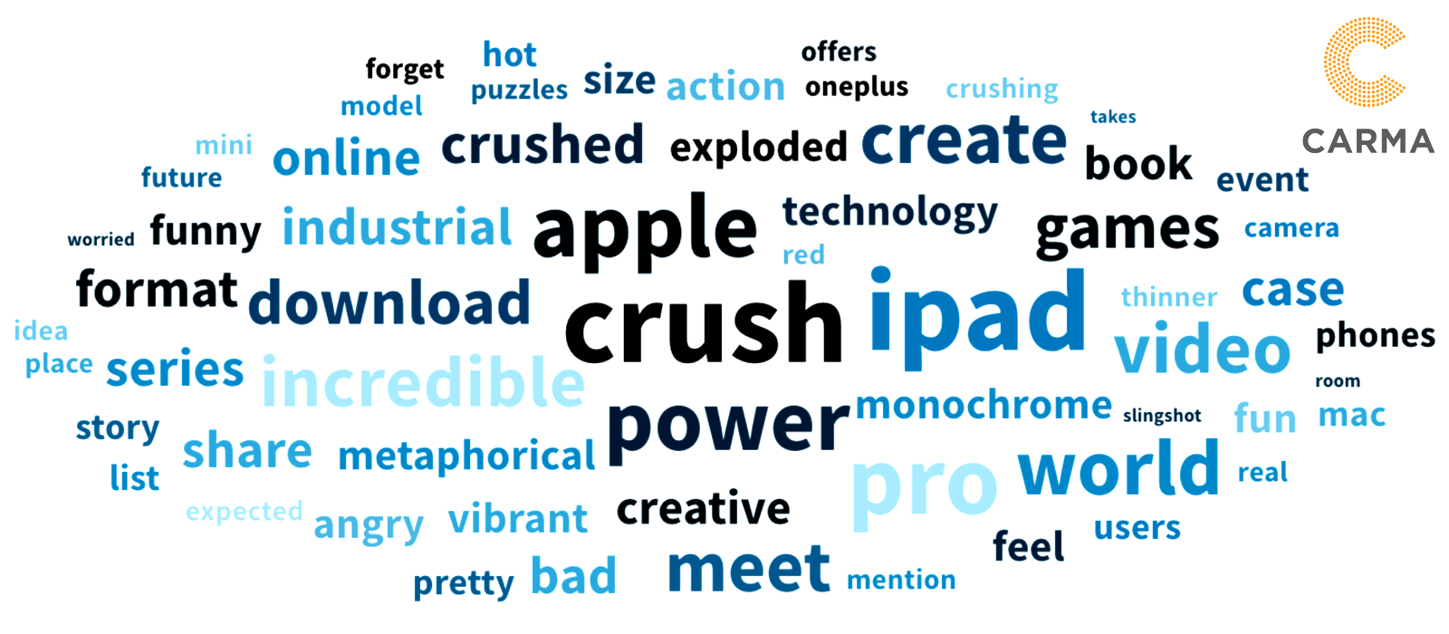 According to media intelligence firm CARMA at the time, words associated with the Apple’s iPad initially were largely positive with words such as “high”, “valued’ and “features”. In contrast, after the Crush advertisement, sentiments about Apple’s iPad dropped to 50.8% positive and 19.7% negative.