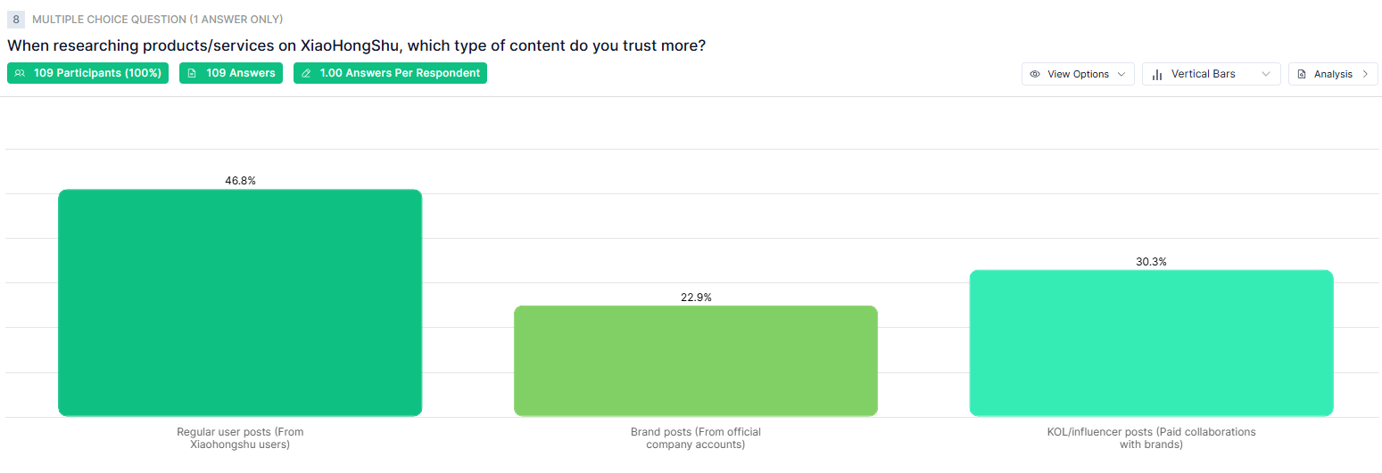 According to the survey, KOL or influencer posts are trusted by 30.3% of users, while just 22.9% rely on official brand accounts, underscoring the dominance of peer-driven content on the platform.
