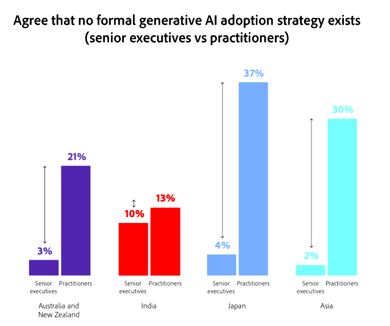 That said, there are no formal generative AI adoption strategies that exist. In Asia, 2% of senior executives conceded that there was no formal strategy compared to 30% of practitioners, it said.