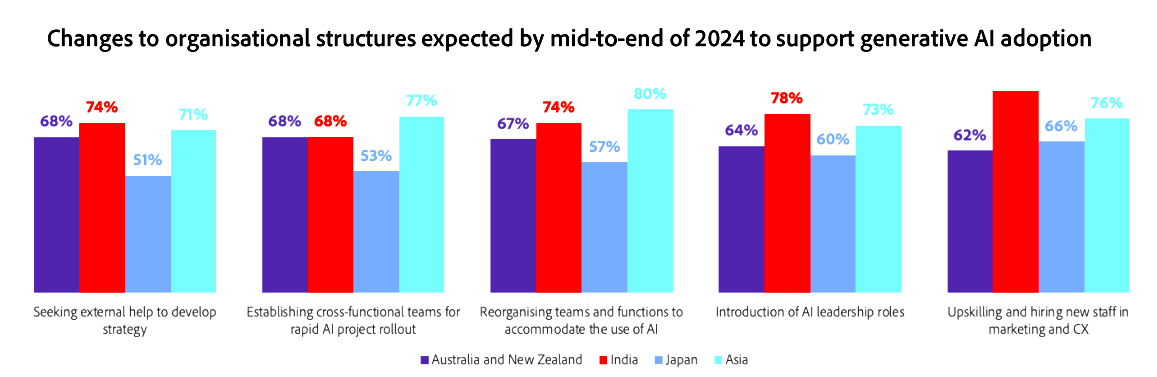 Across APJ, the majority intend to reorganise teams and functions to accommodate AI usage, which is the highest in Asia (80%) and India (74%).
