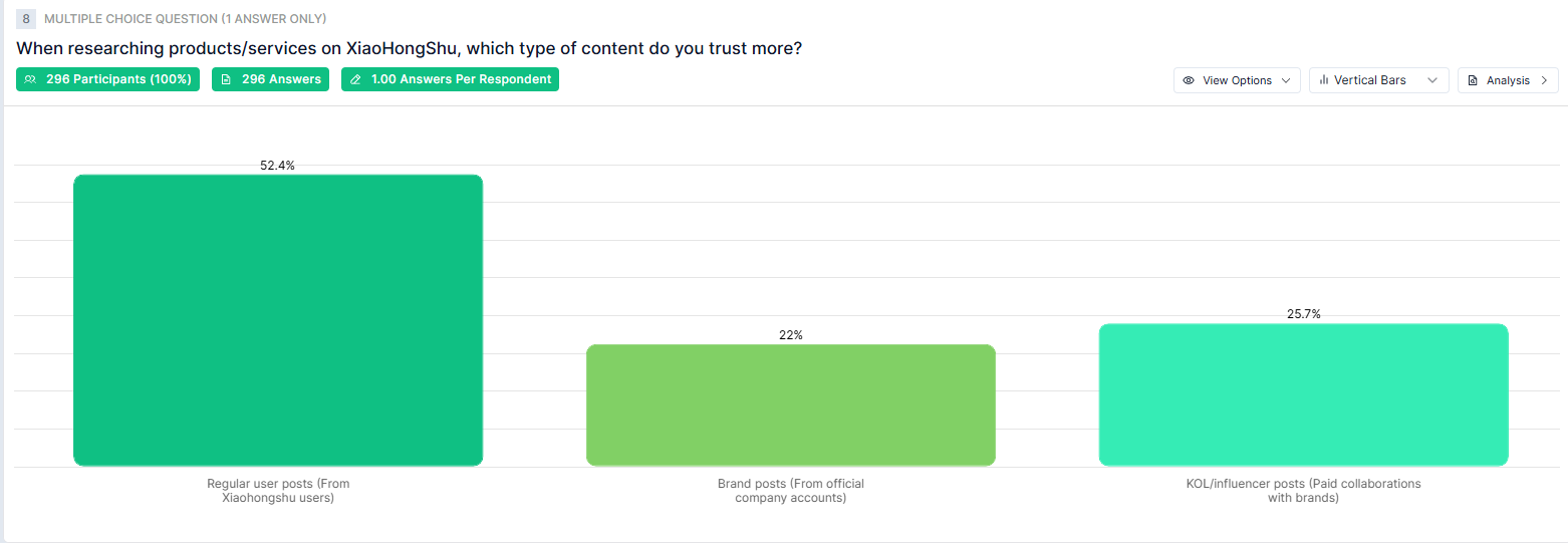 Significantly, 39.2% of Hong Kong users search for brand or product information on the platform weekly, including 27.7% who do so daily. When researching, they trust posts from regular users the most (52.4%), ahead of influencers (25.7%) and brands themselves (22%).