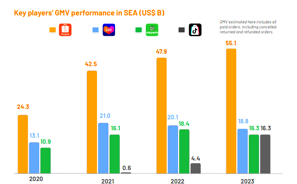 TikTok Shop comes in second as the largest platform in Southeast Asia, having almost quadrupled its GMV in 2023 (US$16.3 billion), according to a recent study by Momentum Works.