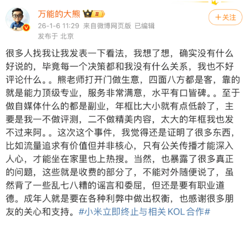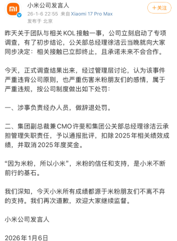 In a statement on its official Weibo account, a Xiaomi spokesperson announced that the company had launched a special investigation. Upon reaching a preliminary conclusion, Xiaomi decided to terminate all contact with the influencer and pledged no future collaborations.