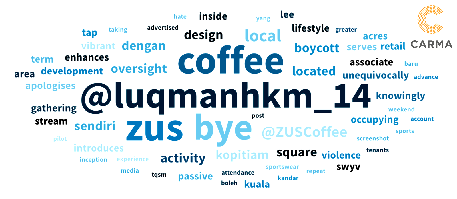 Following the event, ZUS Coffee's conversation sentiments plummeted to 4.7% positive and 40.5% negative with its word cloud including words such as “bye”, “boycott” and “apologises”.