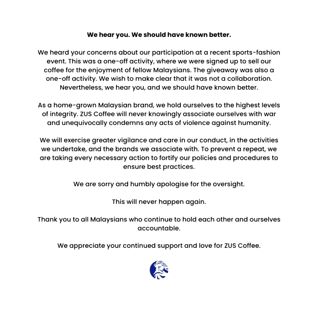 “As a home-grown Malaysian brand, we hold ourselves to the highest levels of integrity. ZUS Coffee will never knowingly associate ourselves with war and unequivocally condemn any act of violence against humanity,” explained the brand.